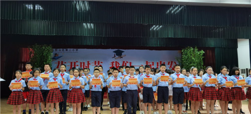 7月4日,眉山市彭山区彭山二小2020届342名毕业生与关心教育他们的学校领导和老师们齐聚学校演播大厅,举行了主题为“花开时节,我们一起出发”的毕业典礼。