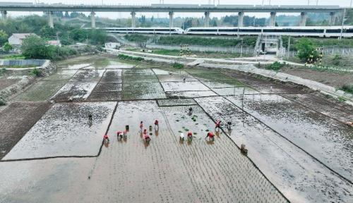 5月4日,内江市东兴区东兴街道陡坎社区志愿者帮助劳弱户抢栽秧苗。