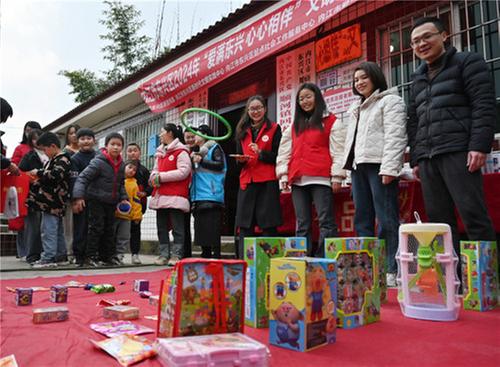 2月2日,在内江市东兴区顺河镇回龙湾村,留守娃娃们正和志愿者一起做游戏。