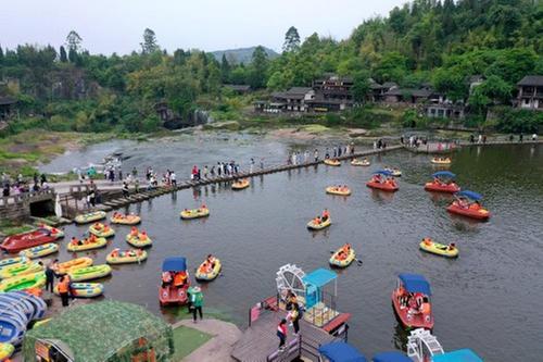 5月1日,游客在位于广安市广安区协兴镇的广安文旅乐活城泛舟赏景。