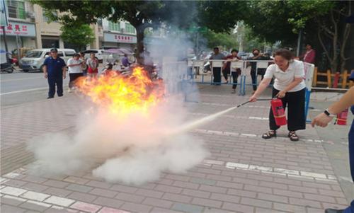 随后消防员进行了灭火器实操讲解。四步要牢记:一提,提起灭火器;二拔,拔下保险销; 三对准,对准火源根部;四压,按下压把扫射灭火。
