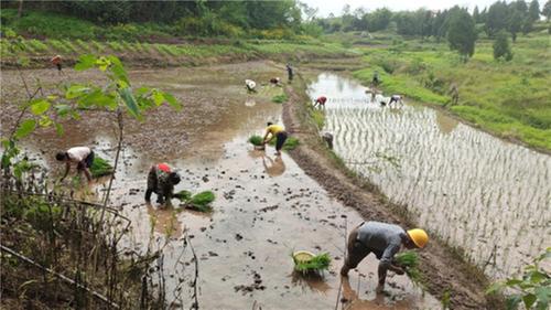 秧田里,农户们熟练地捋顺秧苗,并将秧苗准确地插进泥土里。一株株绿色的水稻秧苗稳稳挺立在水里,呈现出一条条整齐的直线,让水田披上了一层淡淡的新绿,也点缀着波光粼粼的水田,形成了一幅美丽的生产画卷。