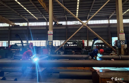 10月11日,笔者来到位于市中区乐贤街道的四川东林重工科技股份有限公司的生产车间,只见机械轰鸣、焊光四射,各种材料整齐地堆放在指定区域,生产线上的工作人员们正埋头苦干。车工、焊工、铆工……每个工序上的工人们都配合默契,大家都利用有效时间抓紧订单生产。