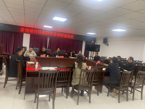 调研组一行在多悦镇召开座谈会。会上,该镇党委委员、副镇长周利向调研组汇报竹林品改项目建设的规划情况和主要存在的问题。市、区两级林业人员分别对该项目的建设背景、项目政策、两级政府重视度等进行详细宣讲和解读。“斑布一号”企业人员表示希望和多悦镇种植大户合作,并提出优惠的合作模式,消除种植大户的主要顾虑。会后,调研组实地查看种植的竹林现状,一致认为多悦镇的林地非常适合开展此次竹林品种改良。
