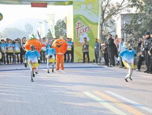 3月13日,广安市邻水县举办2026年“相约明月山 乐跑让水湖”活动,1000余名跑步爱好者在让水湖畔活力开跑,3台智能机器人化身“特别嘉宾”,以动感舞蹈、趣味互动、率先开跑等形式助阵,用满满科技感为赛事添彩。图为活动现场,机器人率先开跑。