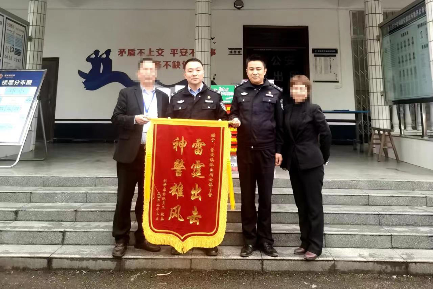 4月2日,普安公司领导来到普安派出所,将一面印有“雷霆出击、神警雄风”的锦旗送到民警手中,对派出所民警的感激之情难以言表。