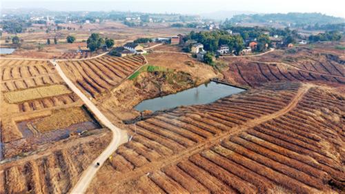 航拍的经过土地整形即将种上李子树广安区悦来镇灯塔村开花水果种植基地。
