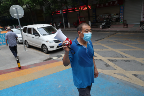 浓洄街道翠屏路社区环卫工周志林在街头用小喇叭通知居民参加核酸检测,汗流浃背