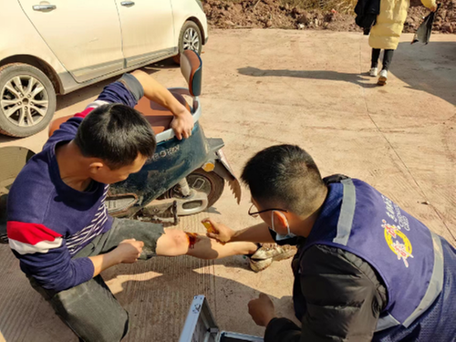 据了解,男子应某强在驾驶摩托车的过程中因驾驶不慎,使摩托车侧滑,致使膝盖和手肘受伤,无法正常行走。范鹏耀发现情况后立即上前查看,并安慰伤者:“别担心,有我们在,没事的。”随即,范鹏耀拿来急救箱,使用剪刀剪开遮挡伤口处的衣物,对伤者的伤口进行清洁消毒及简单的处理后,又驾驶自己的车辆将伤者送往石板凳卫生院做进一步治疗,确认伤者无大碍后,他才悄悄离开……