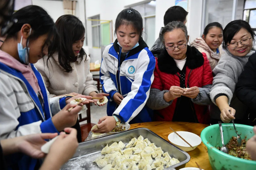 随后,师生走进学校食堂,参加“包水饺、品温暖”活动,老师们就像妈妈一样手把手地教孩子包饺子。