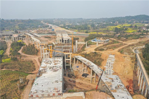 2月25日,成宜高速仁寿段恢复施工点位19个,投入700余名员工和100余台机器,适当延长工作时间,路面和房建单位加大材料储备力度。当天,在ZCB2—1标段,大型运输车辆正配合挖机、勾机进行路基土石方施工,远处路基已经呈现,近处路基开挖处正在加紧施工中。