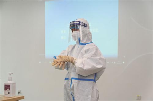 6月22日,在内江市东兴区西林街道晨望社区,西林社区卫生服务中心医护人员现场为企业员工传授防护服穿脱技巧。