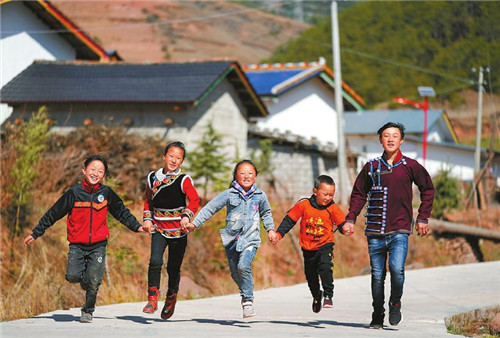 到2019年底,昭觉县解放乡火普村贫困发生率已降至0%。图为3月20日,村上几个孩子在新修的柏油村道上玩耍。记者尹钢摄