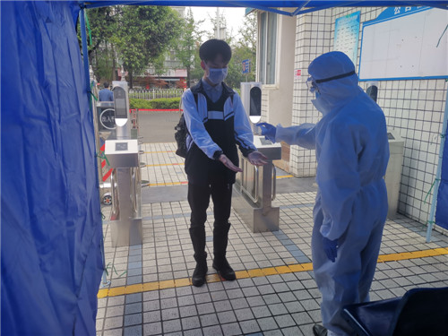 在彭山二中校门处,排队间隔标志十分醒目,校门内摆放着彭山二中疫情防控宣传展板,设置了体温异常临时隔离留观室。返校时,学生佩戴口罩在校门口间隔1.5米列队,接受红外线体温测量和行李消毒,然后进入各班教室,在班主任处完成报名工作。报名时,学生要填交健康申报卡和承诺书,再次接受体温测量并登记,然后在班主任组织下完成个人课桌整理和环境卫生打扫。对于住校生,学校允许他们提前30分钟进校到住宿区办理入住,在政教处和生活老师安排下严格按每室4人的标准完成入住。