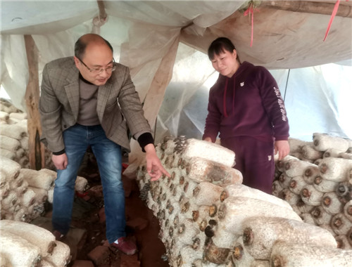 记者带着好奇心跟随蔡支书走近这户王姓人家,在一个不太起眼的棚子里整齐排列堆放着很多白色条形小包,有的已经长出了蘑菇,兴隆镇农技干部龙勇正在指导业主种磨茹技术。