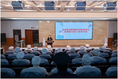 培训会上,校长陈曦就如何抓实抓细做好防疫工作、如何强化校园安全管理工作传达了上级文件精神,并对疫情防控、后勤安全工作做了具体的安排部署。她要求与会人员要增强责任意识、安全意识,以真干、实干诠释后勤人的责任和使命,营造优美、干净校园环境,确保全体师生身心及舌尖上的安全,为学校开学工作稳步推进提供强有力的保障。