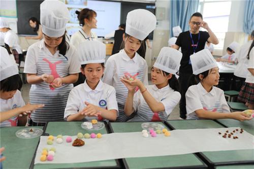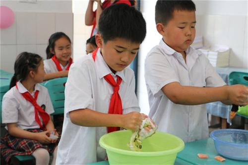 而在学校操场一角的四年级种植园,男孩子戴着草编帽,女孩子系着花头巾,在花卉角和蔬菜角精心地种植着,松土、刨坑、浸坑、栽苗、压土、浇水。走进五年级的教室,一位位戴着厨师帽,系着布围裙的小厨师们正在桌边忙碌着,不一会儿,大小均匀、形状美观的汤圆就包好了。六年级的大哥哥、大姐姐们则向大家展示了钉纽扣, 搏得了到场师生的阵阵掌声。