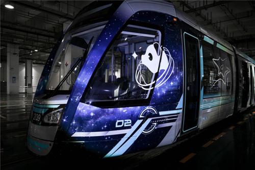 “为了营造深邃感和神秘感,我们经过多轮打磨,最终确定了主题列车的设计方案。”成都轨道集团相关负责人介绍,“蓉遇未来”主题列车以银蓝色为主色调,车身设计融入机甲元素,玻璃贴加入星云造型以及本次大会的吉祥物熊猫“科梦”,当乘客踏上这列“未来列车”,就会仿佛穿越星空,开启一场时空漫游。