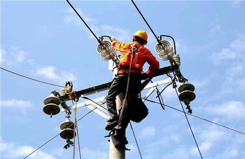 7月9日,高温天气下,国网通江县供电公司施工人员在10千伏涪草线七水村支线防山火整治施工现场,进行放紧线作业,保障群众用电。