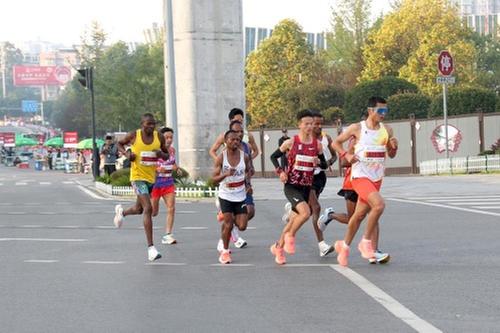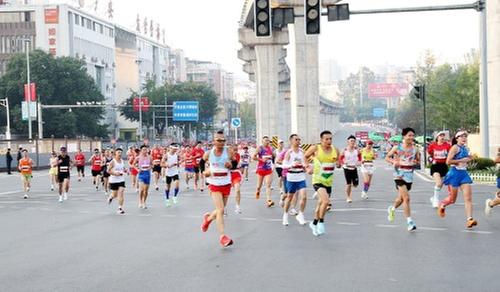 10月15日,参加2023中国人寿广安红色马拉松赛的选手在邓小平故里旅游区赛道上燃情开跑,向着终点进发。