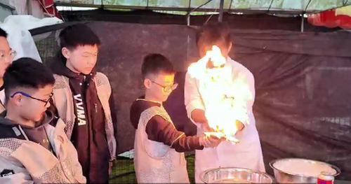 在银城花海公园,导师团队为大家带来了“科普秀”互动体验课。“火焰掌”演示、空气炮发射、马德堡半球实验等,一个个科学表演引来同学们阵阵欢呼,藏在生活细节里的科学原理,在实验中被一一拆解。