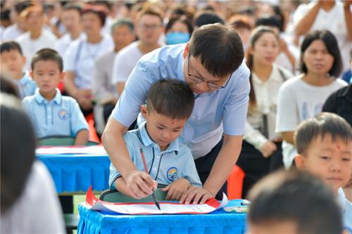 开学典礼上,学校支部书记、校长曹海莹为新学期开学典礼致辞,他肯定了过去一学年里全体师生所做出的努力和贡献,并向全体学生提出了新的要求和希望。接着,举行开笔活动(正衣冠、家校交接、拜师礼、朱砂启智、击鼓明智、启蒙描红)。会上,学校邀请的京剧表演肖老师和跳绳总辅导陈老师为学生表演了精彩的节目,她们的表演获得了孩子们阵阵掌声和欢呼声。会上对全校32名优秀教师进行了表彰奖励。开学典礼在全体师生一起朗诵《请党放心 强国有我》中落下帷幕。