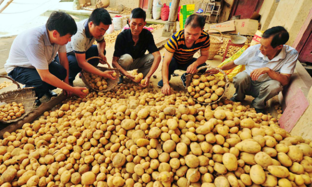 8月7日,巴中市南江县和平乡磨垭村农民正在分选合作社丰收的马铃薯,准备运往县城超市销售。