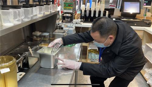 执法人员以奶茶制作区和原料储存区为重点,重点对店内环境卫生、食品原料是否在保质期内、原材料进货渠道是否正规且票据是否齐全、经营者是否做好台账记录等进行了详细检查。