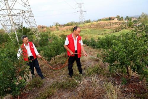 8月25日,在广安市广安区悦来镇中合村“麻得甩”花椒产业基地,该村党员志愿者正在利用喷灌系统浇水抗旱,为花椒“解渴”。