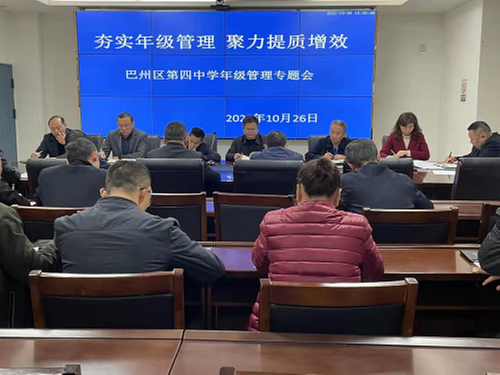 为落实教育教学常规工作, 进一步推进教学改革,10月26日,巴中市巴州区第四中学召开以“夯实年级管理,聚力提质增效”为主题的年级管理专题会。学校校级领导、相关处室和各年级主任参会。