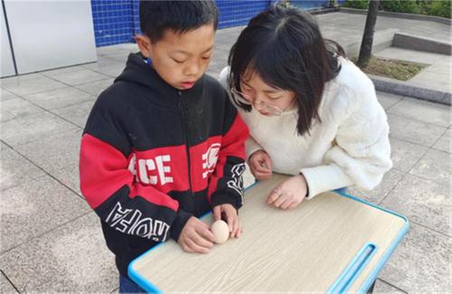 “春分到,蛋儿俏”。学生们用彩笔在准备好的鸡蛋上绘制各种图案,普通的鸡蛋在大家的创造下变得五彩斑斓。画好后,学生们小心翼翼地将鸡蛋扶正、立稳、放手,在一次次尝试下,成功将鸡蛋立在课桌上,一张张脸上洋溢着欢快的笑容,成就感十足。