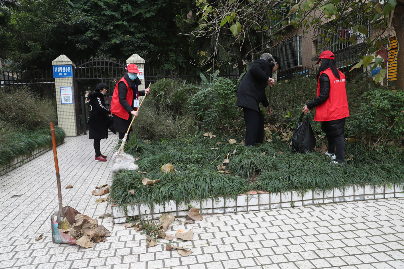 12月20日,广安市广安区浓洄街道果丰社区网格员正与当地居民一道清扫鸿都香榭小区绿化带的垃圾,让城市更文明更美丽。