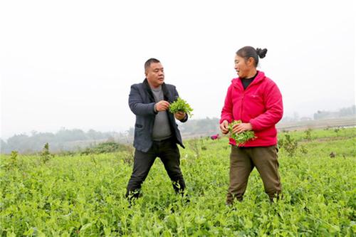 东岳镇种植业主邓刚(左)在指导村民掐豌豆尖