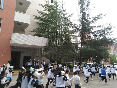 上午第一节下课前十分钟,学校广播再次对师生进行防震应急疏散方面的知识培训。下课铃响起,学校拉响防空警报信号,警示地震即将发生,当堂课的老师指导学生尽可能卷曲身体躲避在课桌下。警报解除后立即指导学生用书包或者书本遮住头部、弯腰捂鼻、迅速有序地按指定路线“逃生”。各岗位老师、安保、教官在负责区域指挥学生有序撤离,并提醒学生注意安全。全体同学认真对待,动作规范,迅速到达指定安全区域,各班清点人数,及时向教官报告。