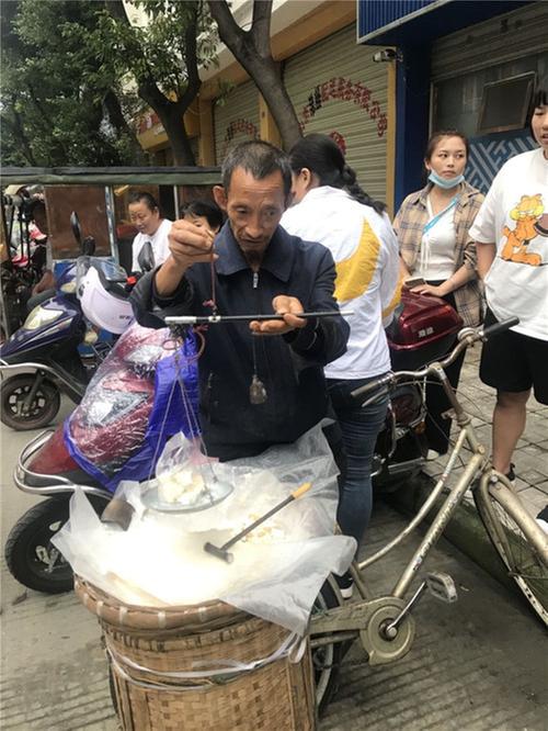 “我生产的麻糖都是自己零售卖出去的”。何建国介绍,每天一大早,他就会把按定量制作的麻糖,摊放在圆形的竹编盖上,连同背篼一起栓实在自行车后座,然后便骑上车开始一天行程,不是转悠在城区大街小巷,就是穿梭在乡村院落,随着一阵阵“叮当”敲打的叫卖者,时不时引来购买麻糖的“好吃嘴”。