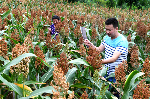 陈福元介绍,报国村是省定贫困村,将于2019年脱贫摘帽。为帮助群众发展脱贫增收产业,该村结合官盛镇境内和周边酒厂对优质高粱需求量较大的实际,通过与酒厂对接,积极发展一年产两季的“糯米1号”红高粱,着力将全村打造成乡村酒厂的原材料供应基地。