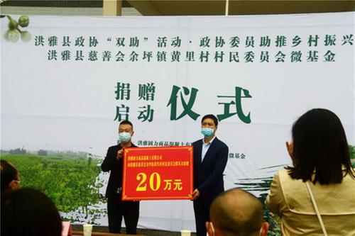 活动中,现场宣布启动“洪雅县慈善会余坪镇黄里村村民委员会微基金”。爱心企业“固力商砼”为该村“微基金”平台捐赠资金20万元,专项用于开展“三农”人才培养、产业技术研发及基础设施建设,尤其是在茶产业、藤椒产业等方面进行专项帮扶。该基金负责人表示,将规范使用微基金平台,把社会捐助、企业扶持款项有效运用于助推乡村振兴、服务民生实事上,为全县“两山”转化示范县、绿色发展先行区建设提供生动实践。