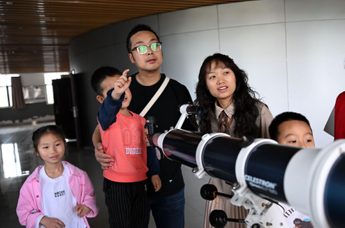 4月11日,在内江师范学院地理科普基地,孩子们在家长陪伴下学习天文科普知识。