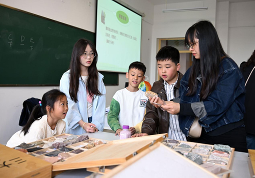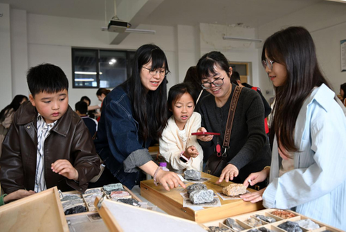 4月11日,在内江师范学院地理科普基地,孩子们和家长一起参与亲子岩石辨识活动。