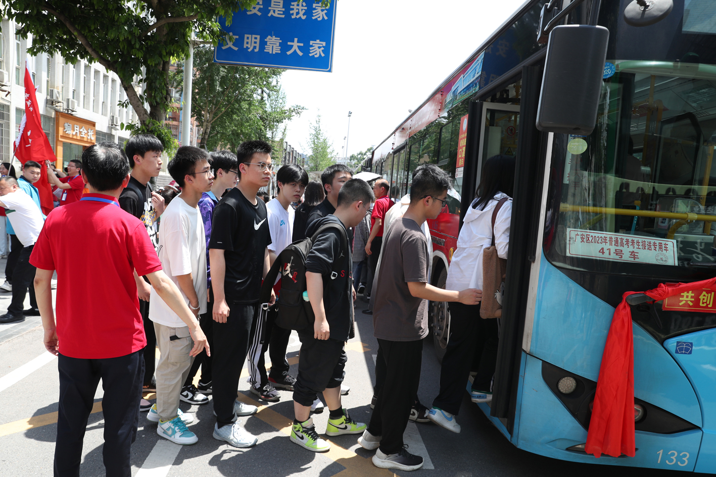 6月6日下午,广安市友谊实验学校大门口,该校高三高考生正在排队登上“爱心护航专车”准备到高考考点熟悉考场。