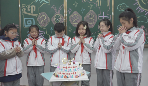 刘欣妍唱完祝福歌后非常开心地说“老师把我们的教室布置得很漂亮,我非常的开心,也很惊讶,老师还为我们准备了一个大蛋糕,希望新的一学期我的成绩能够有所提升。”
