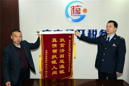 12月15日上午,广安经开区护安镇双碑村党支部副书记张泽文代表全村村民,将一面印有“扶贫济困送温暖 真情帮扶暖人间”字样的锦旗,送到国家税务总局广安经济技术开发区税务局党委书记、局长赵国勇的手中,衷心感谢该局的大力帮扶。