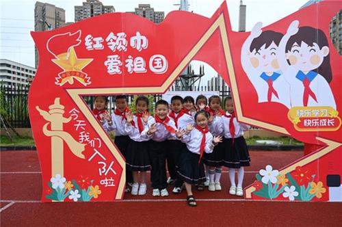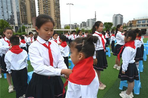 5月29日,在内江市东兴区牛牦山小学,新入队的少先队员们一起分享了获得红领巾的喜悦。