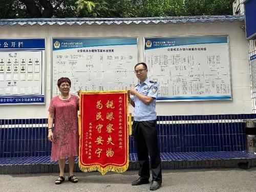 近日,陈女士将挎包遗忘在翠屏路药房外的长椅上,包内装有治病的现金以及身份证、社保卡等重要物品。陈女士立即来到浓洄派出所求助,值班人员立即为其查询周边视频监控,经查看,10时50分左右包被一男子拾取,民警核实其身份后联系该男子,其于16时许将挎包归还陈女士。陈女士找回挎包后,主动送感谢信和锦旗到浓洄派出所表示感谢。