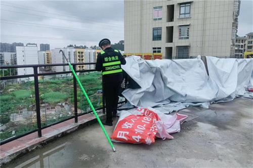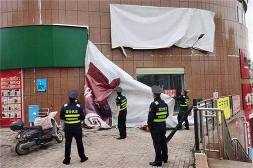 拆除现场,执法队员分工配合,在确保安全的前提下,利用拆除工具对过期条幅、破损户外广告进行清理。并就户外广告、店铺招牌设置标准和审批事宜现场对物业管理公司及商户进行宣讲,同时要求汇点商贸城物业管理公司督促商户定期对过期、破损广告进行清除、更换,确保广告设置规范、美观。