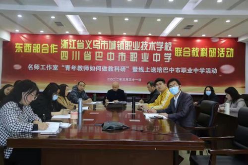 3月31日下午,巴中市职业中学和浙江省义乌市城镇职业技术学校开展了线上联合教研活动。教研活动由领导致辞、论文宣讲、专家讲座与指导交流、活动总结四个环节组成,两校教学骨干教师团队及名师工作室成员参与了教研活动。