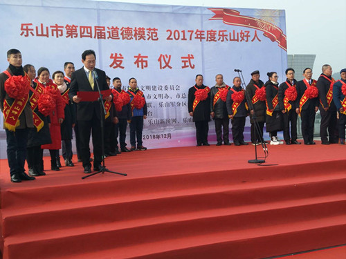 于丽表示,今年评选出了11位乐山市第四届道德模范和10位2017年度乐山好人,他们来自不同的行业和地方,在各自平凡的岗位上,用自己的实际行动,充分展现了助人为乐、见义勇为、诚实守信、敬业奉献、孝老爱亲的道德风貌。他们的高尚品德,温暖了人心,感动了乐山,他们的先进事迹值得全市广大干部群众学习。