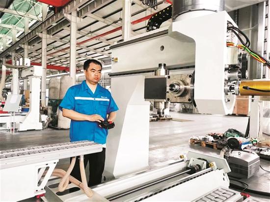 近日,记者在四川省青城机械有限公司见到了张自鹏,他身穿工作服,正在调试木工五轴联动加工中心。