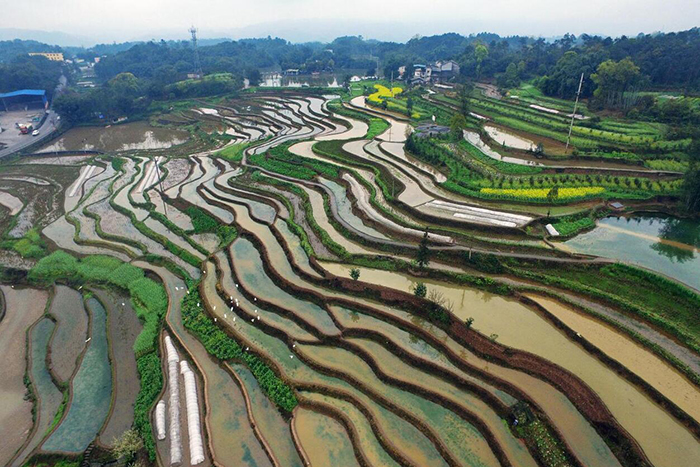近年来,泸州市纳溪区以严守耕地保护红线为核心,规划传统农耕带动乡村种养殖业、农事体验、乡村旅游及农副产品加工等涉农产业的示范片,发展经济的同时构筑可持续发展的“耕地长城”。图为3月20日,纳溪区上马镇太平村村民起埂蓄水备春耕,田埂与水田形成美丽的画卷。(杨涛 陈学强 摄影报道)