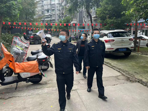 “各位居民,请戴好口罩,下楼做核酸了!”10月10日清晨,在广安市岳池县九龙街道书香街的书香学庄小区,小喇叭持续响起,一群身工作制服的岳池县应急管理局干部正手持小喇叭,穿行于小区各楼幢间,逐幢逐户敲门,提醒小区居民做核酸。